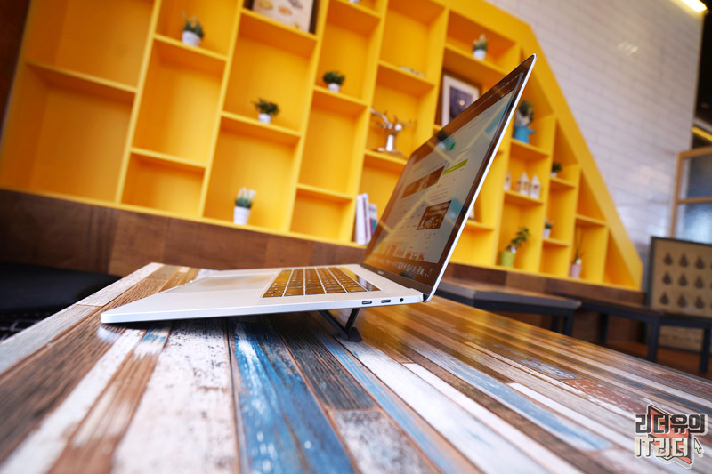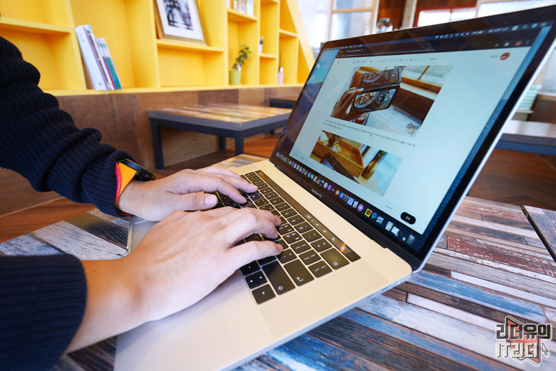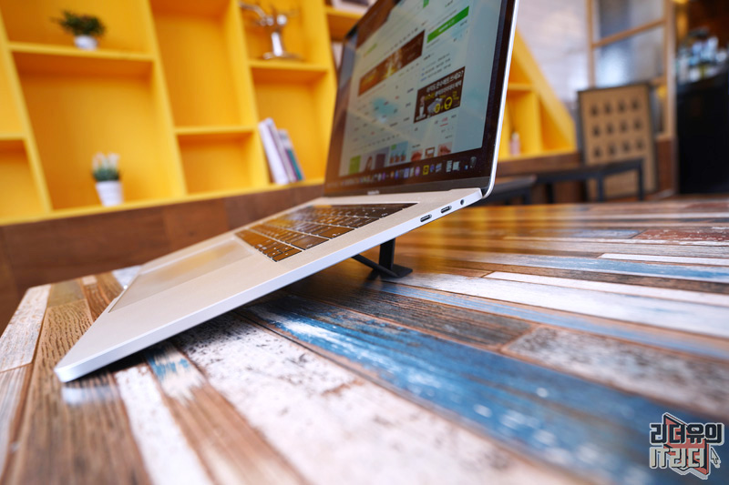 맥북프로를 펼치면 이런 느낌으로 사용하게 됩니다. 괜찮죠~ 어디서나 입력이 편한 각도를 만들 수 있기 때문에 사용하기 좋습니다.