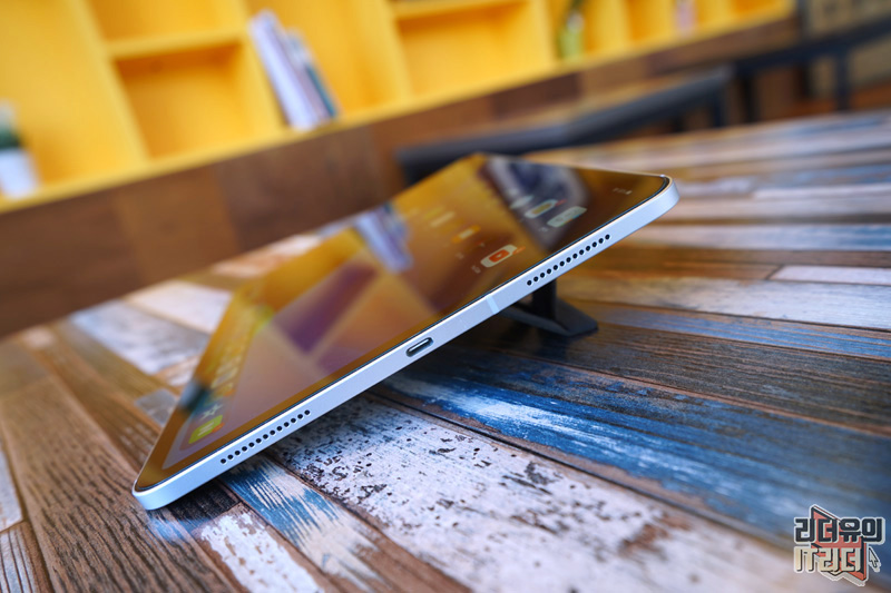 아이패드 프로 3세대에 테스모 킥스탠드를 부착한 모습입니다. 별도의 케이스나 거치대를 사용하지 않는 분이라면 이렇게 거치해서 그림이나 간단한 입력을 할 수 있습니다.