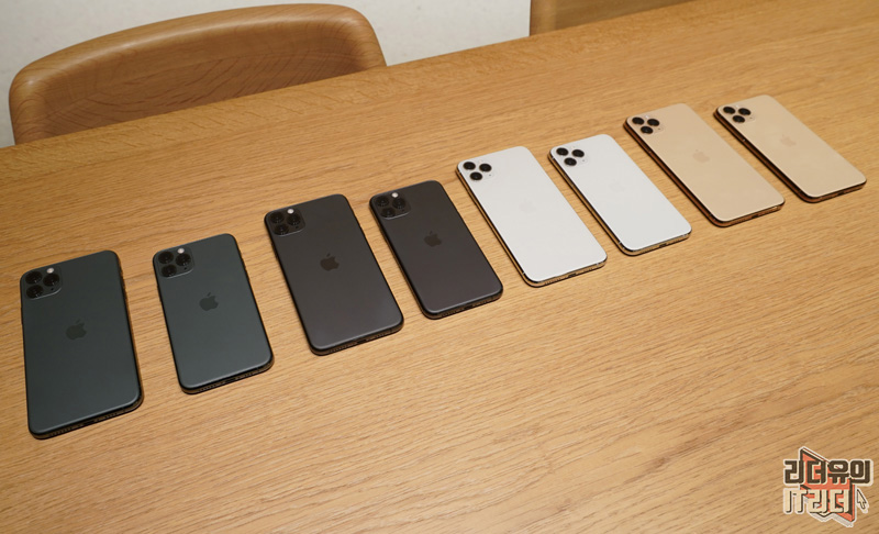 위에는 아이폰11 프로와 맥스를 나열했고 아래쪽에는 아이폰11의 모든 색상을 나열했습니다. 한자리에 모아두니 어떤 색상이 가장 예쁘게 느껴지나요?