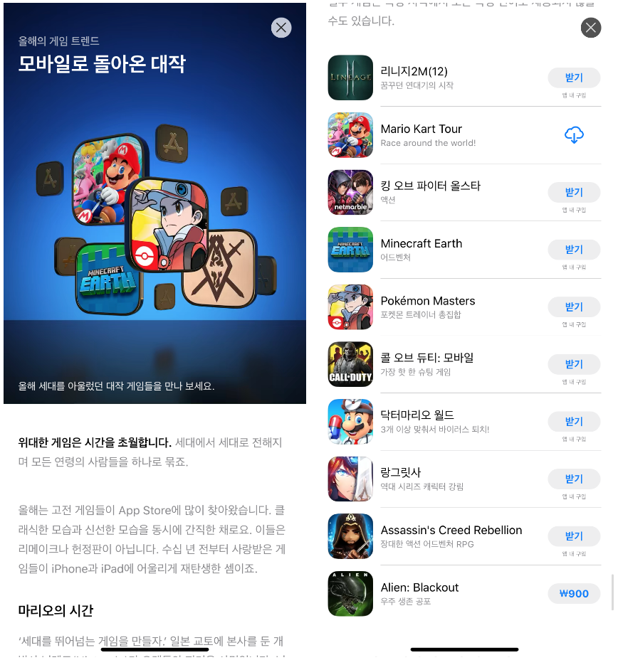 모바일로 돌아온 대작을 크게 들수 있다고 합니다. 유명한 브랜드 게임들이 iOS에서 구현되기 시작했는데요. 킹오브파이터올스타, 마리오카트투어, 마인크래프트이어스, 포켓몬 마스터스, 콜오브듀티 모바일, 닥터마리오 월드, 랑그릿사, 리니지2M 등 단순한 리메이크 헌정작이 아니라 모바일에 최적화된 오리지널 게임들로 나와 모바일 시대에 대응하고 있습니다.