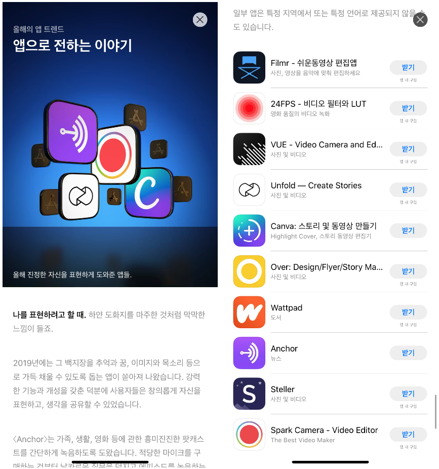 2019년에는 나를 표현할 수 있게 도와주는 앱들이 주목을 받았습니다. 팟캐스트를 더 간단하게 녹음할 수 있도록 도와주는 앱, 창작 활동을 도와주는 Wattepad 같이 창작자가 쉽게 작업을 할 수 있는 앱, 다양한 태플릿과 서체로 디자인을 도와주는 앱, 동영상을 만드는 앱 등 누구나 작가, 포토그래퍼, 디자이너, 영화 감독, 팟캐스터가 될 수 있는 앱들이 많이 나온 한해 였다고 합니다.