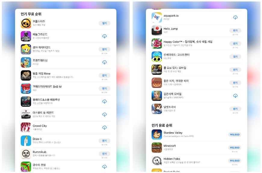 아이패드 인기 무료 순위 1위는 브롤스타즈 입니다. 그 다음은 배틀그라운드가 여전히 인기를 모으고 있습니다. 프렌즈레이싱은 조금 아래 있지요. 아이폰과 아이패드로 즐기는 게임 취향이 조금씩 다름을 알 수 있습니다.