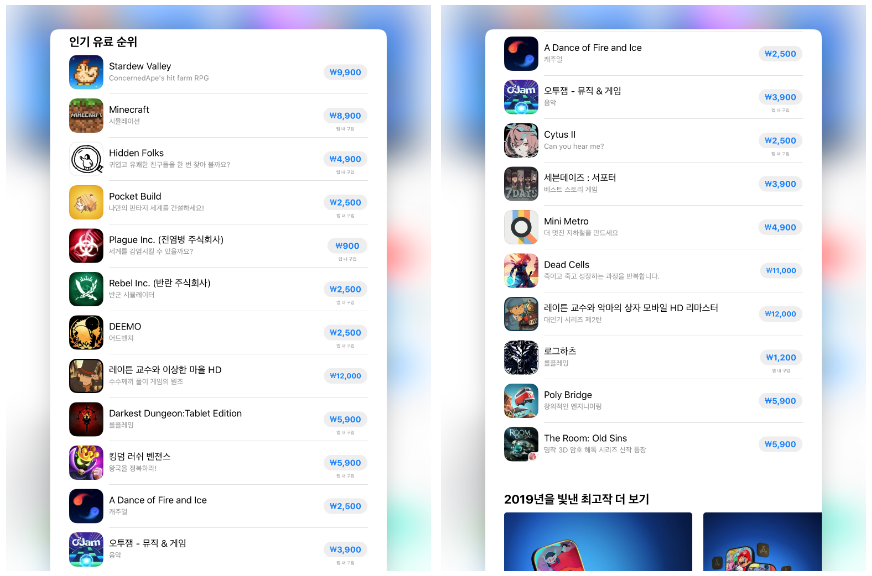 아이패드 인기 유료 순위 1위는 Stardew Valley 입니다. 아이폰 유료 게임 순위와 1, 2위가 바꼈습니다. 아이패드에서 즐기는 게임의 매력은 기대 이상으로 좋으니 다양하게 접해 보시면 좋을 것 같습니다.