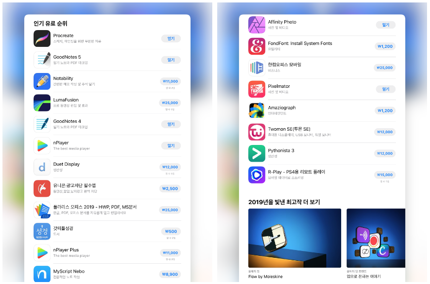 아이패드 앱 인기 유료 순위 1위는 프로크리에이트 입니다. 저도 사용하고 있는 앱으로 최고의 페인팅 앱입니다. 굿노트5가 여전히 인기를 얻고 있고 동영상 편집앱인 루마퓨전도 좋은 반응을 얻고 있습니다.