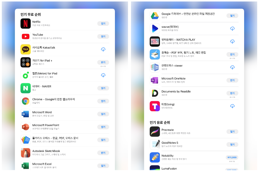 아이패드 앱 인기 무료 순위 1위는 아이폰과 다르게 넷플릭스가 1위를 차지했습니다. 그다음 유튜브로 영상을 보는 앱들이 사랑을 받았고 독특하게 카카오톡도 아이패드에서 많이 활용되고 있음을 알 수 있습니다.
