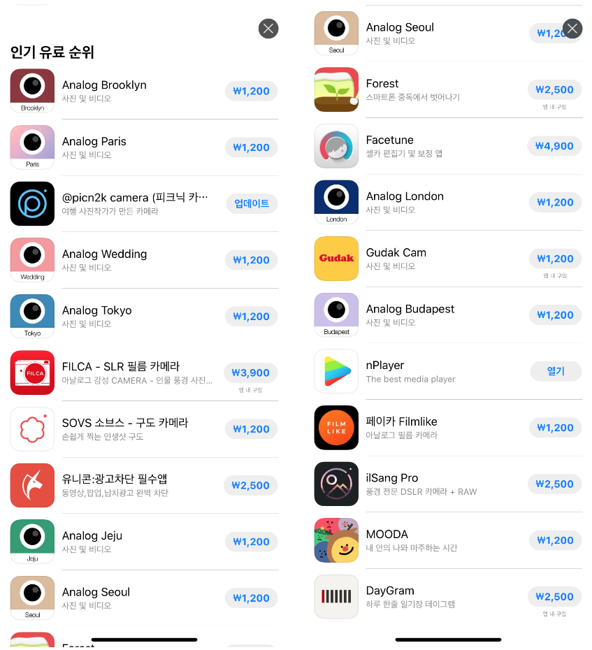 인기 유료 순위 1위는 Analog Brooklyn 입니다. 유료앱들을 보면 거의 다 사진 및 비디오 관련 앱임을 알 수 있습니다. 그만큼 꾸미기에는 돈을 아끼지 않는다는 것을 알 수 있습니다.