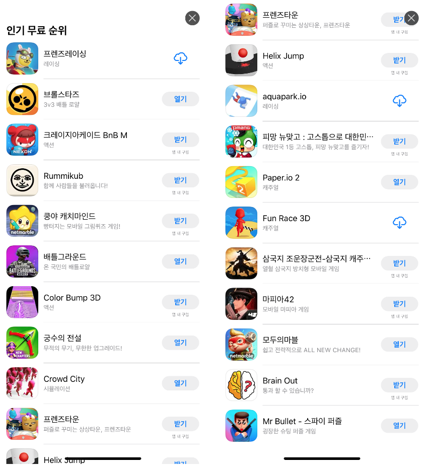 아이폰 인기 무료 순위 1위는 프렌즈레이싱 입니다. 그다음 브롤스타즈, 그다음 크레이지아케이드 같이 캐쥬얼한 게임들이 사랑을 받았습니다. 배틀그라운드의 인기가 주춤해졌네요~