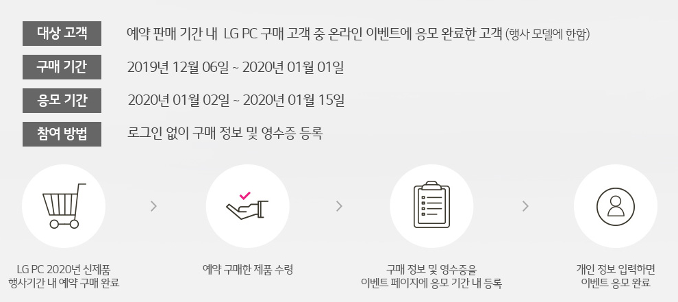 2020 LG 그램 17 예약판매 기간은 2019년 12월 6일부터 2020년 1월 1일까지입니다. 응모기간은 2020년 1월 2일부터 15일까지이고 로그인 없이 구매 정보 및 영수증 등록을 하면 혜택을 받을 수 있으니 잘 참고하셔서 이용하시면 되겠습니다.