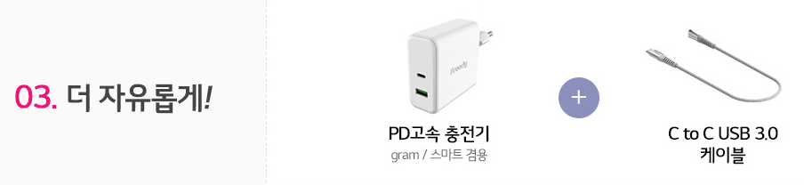 세 번째 혜택은 PD 고속 충전기와 C to C USB3.0 케이블 증정입니다. 2020 LG 그램 17은 여유로운 사용시간을 가지고 있지만 카페, 도서관 등 야외에서 사용하는 경우가 많으면 고속 충전도 필요할 수 있으니 이런 액세서리는 하나쯤 가지고 있으면 아주 유용하게 활용될 수 있습니다.