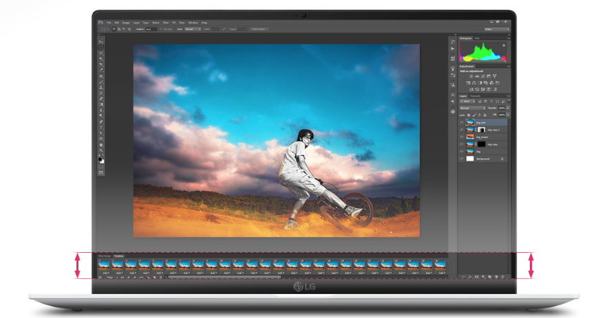 LG그램17은 최초로 17인치 노트북 시장을 연 그램답게 넓은 17형 화면과 작업에 효율적인 16:10 화면비를 가지고 있는데요. 뿐만 아니라 WQXGA(2560*1600)의 고해상도를 가지고 있어 문서 작업은 물론 사진/영상 편집 작업, 콘텐츠 감상 시에도 적합합니다.