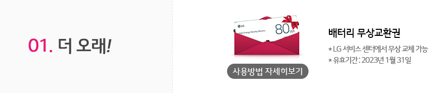 첫 번째 혜택은 배터리 무상 교환권을 제공합니다. 2023년 1월 31일까지 무상 교체가 가능한 혜택인데요. LG전자가 닐슨 소비자 조사를 통해 배터리 교체를 필요로 한다는 걸 알았고, 그 대안으로 준비한 혜택입니다. 보통 노트북 배터리는 수명이 있기 때문에 몇 년 사용하다보면 수명이 닳아 시간이 줄어드는데, 교체하면 배터리를 더 오랫동안 안심하고 사용할 수 있습니다. 또한 배터리 수명이 줄어들면 전체적인 하드웨어 속도도 느려지기 때문에 3년정도 사용하다 배터리를 교체하면 처음 노트북을 샀을 때의 배터리와 속도를 느낄 수 있어 큰 효과를 보게 될 것입니다. 아주 유용한 혜택입니다.