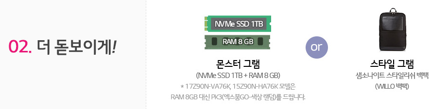 두 번째 혜택은 NVMe SSD 1TB + RAM 8GB 추가 혜택 또는 샘소나이트 스타일리쉬 백팩을 선택할 수 있습니다. 처음부터 아예 파워풀하게 용량과 RAM을 늘려 2020 LG 그램 17을 더욱 강력하게 만들거나 2020 그램17을 휴대할 수 있는 세련된 백팩으로 멋을 낼 수 있는 선택지입니다.