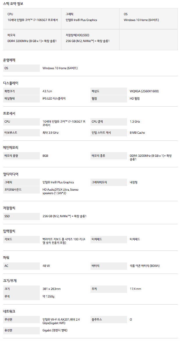 2020 LG 그램 17 스펙은 다음과 같습니다.(i7 기준)