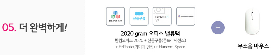 다섯 번째 혜택은 2020 그램 오피스 밸류팩과 무소음 마우스 증정입니다. 2020 그램 오피스 밸류팩에는 한컴 오피스 2020과 산돌구름 폰트, 이지포토, 한캠 스페이스를 포함하고 있습니다. 별도의 오피스 프로그램을 사지 않아도 되고 세련된 폰트로 감각적인 문서 작업이 가능하니 특히 과제가 많은 대학생분들이나 문서 작업이 많은 직장인분들이 주목해봐야 할 혜택입니다. 또한 독서실이나 도서관에서 활용성이 높은 무소음 마우스도 증정되니 이점 참고해 두시면 좋을 것 같습니다.