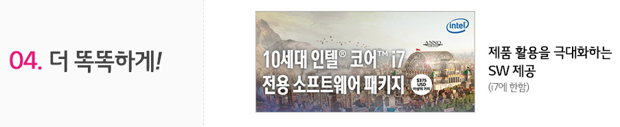 네 번째 혜택은 10세대 인텔 코어 i7 전용 소프트웨어 패키지 입니다. i7 제품에 한해 제품 활용을 극대화하는 SW제공을 하니 이런 부분도 활용하시면 좋습니다. 소프트웨어 패키지에는 $375 밸류의 정품 이미지 편집 Painter Essentials 7, 동영상 편집 MAGIX FASTCCUT 2018, 인기 전략게임 ANNO 1800, 9종의 정품 소프트 웨어 및 구독권이 들어있어 사진, 영상 편집 프로그램, 게임을 별도로 유료 구매하지 않고도 그램17 제품을 아주 제대로 활용할 수 있습니다.