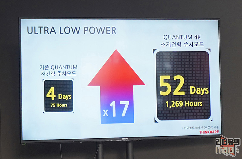 그리고 상시 녹화시 항상 불만이 되었던 주차 녹화 시간은 초저전력 주차모드로 최대 52일을 사용할 수 있습니다. 물론 보조배터리를 사용해 녹화한 시간이라는 점은 참고해 둘 필요가 있습니다.
