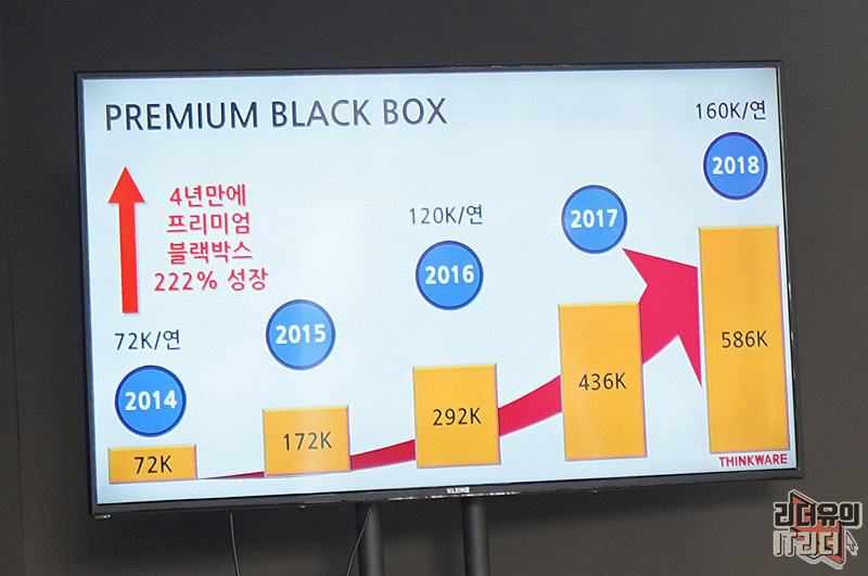프리미엄 블랙박스의 성장 곡선입니다. 블랙박스는 사고가 나지 않으면 의미 없는 제품처럼 보이지만 사고가 났을때 블랙박스는 중요한 증거 자료가 되어 억울한 일을 만들지 않습니다. 단 한번의 사고가 인생을 망칠수도 있기 때문에 블랙박스는 믿을 수 있는 제품을 사용해야 합니다. 그런 인식이 자리 잡히면서 더 빠르게 프리미엄 블랙박스 시장이 커져가고 있습니다.