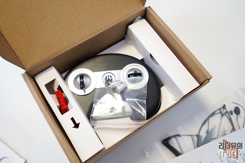 리모컨과 조립 구성품이 들어 있습니다.