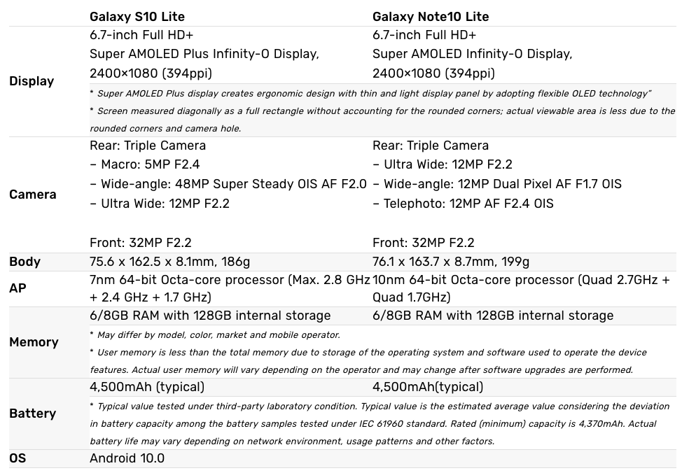 갤럭시S10 라이트 스펙 VS 갤럭시노트10 라이트 스펙 차이