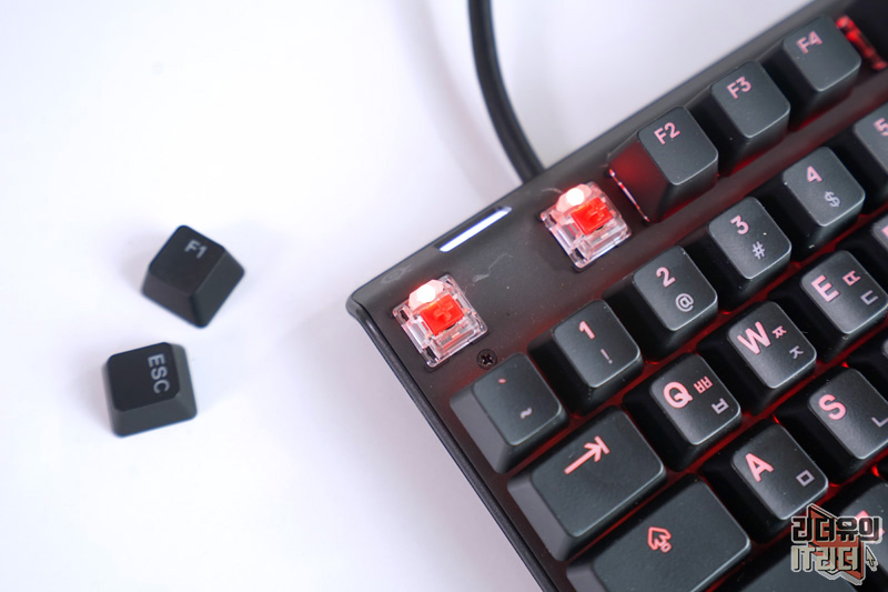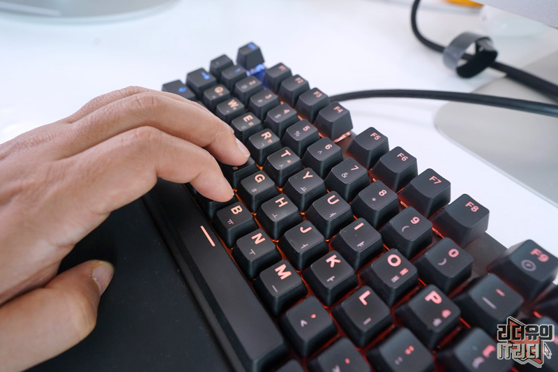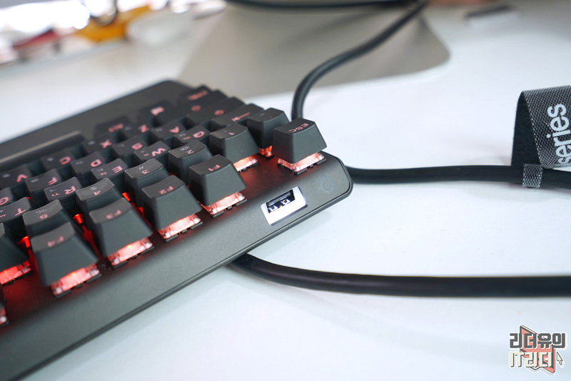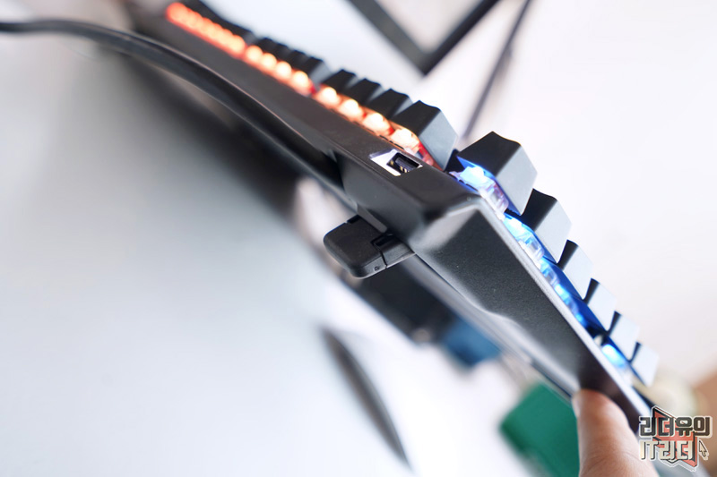 앞에 보면 USB 패스스루 포트가 있습니다. USB 장치 연결을 할때 본체에서 찾기 위해 애를 쓸때 있는데 키보드에서 바로 꼽을 수 있어 좋습니다.