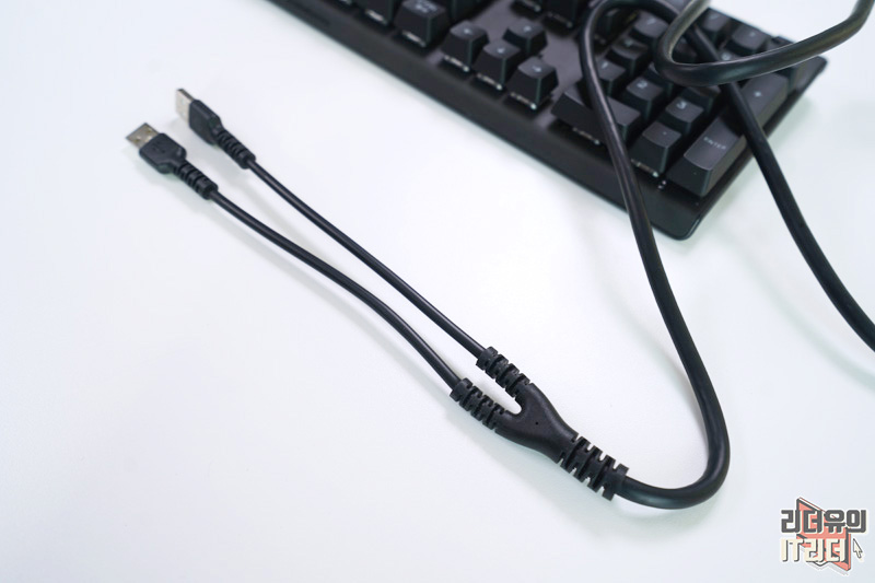 케이블은 두개의 연결 단자를 제공합니다. 하나는 키보드를 연결하는 케이블이고 다른 하나는 USB 패스스루 포트를 연결하는 케이블 입니다.