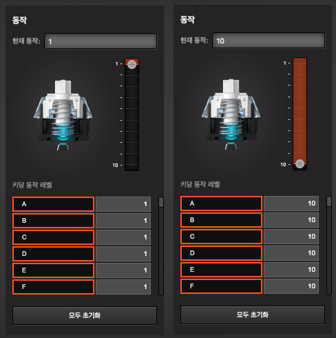 감이 잘 안오시죠? 세계에서 가장 빠르고 가벼운 감도를 설정할 수도 있고 업무에 따라 민감도를 낮춰 그에 맞게 키보드 사용을 할 수 있게 한 것입니다.