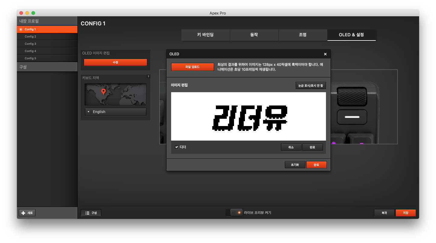 OLED 디스플레이에 자신만의 서명을 두어 나만의 키보드로 설정 할 수 있는 매력도 있습니다. 이미지나 그리기로 넣을 수 있는데요. 참고로 흑백만 가능합니다.