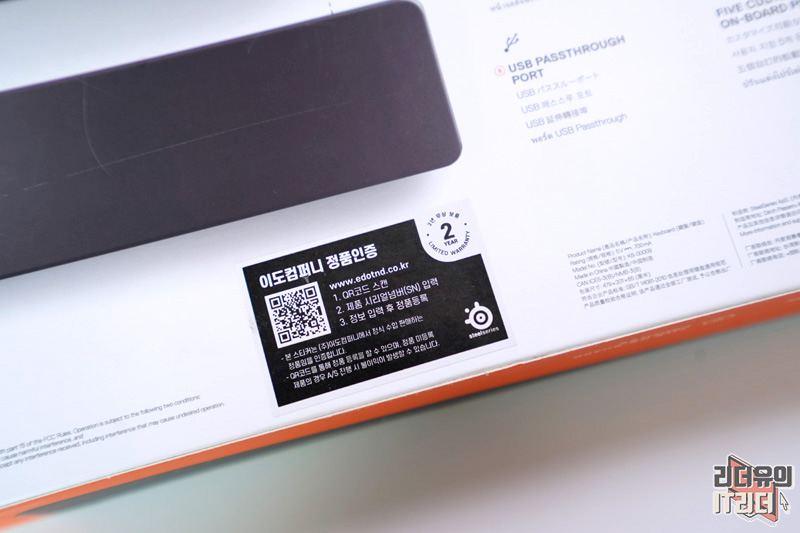 스틸시리즈 APEX Pro는 국내 공식 수입원 이도컴퍼니의 제품을 구매하고 정품등록을 진행해야 추후 AS를 2년간 보증 받을 수 있습니다.