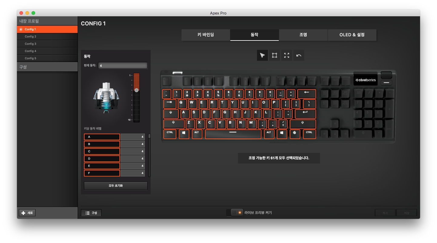 스틸시리즈 엔진3 프로그램에 가면 키 바인딩, 동작, 조명, OLED&설정을 할 수 있는데요. 동작에 가면 레벨을 설정할 수 있습니다.