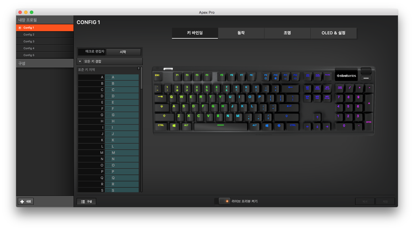 이런 설정들은 스틸시리즈 엔진3 프로그램에서 할 수 있습니다. 스틸시리즈 홈페이지 가면 다운로드 받을 수 있습니다.