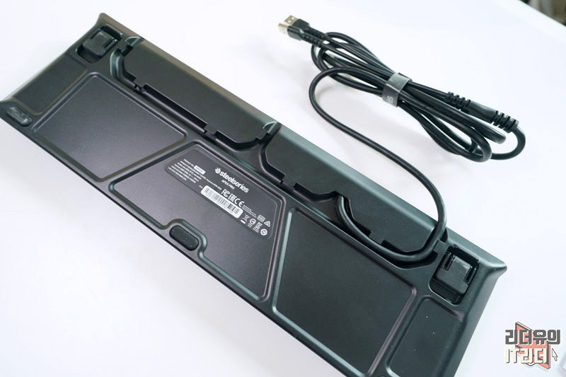 스틸시리즈 APEX Pro는 케이블 일체형으로 되어 있습니다. 바닥면을 보면 스틸시리즈의 섬세한 설계를 볼 수 있는데요. 3가지 케이블 라우팅이 있어 사용자 환경에 따라 케이블을 깔끔하게 정리할 수 있게 되어 있습니다. 작은 부분일 수 있지만 사용자를 고려한 설계가 인상적입니다.
