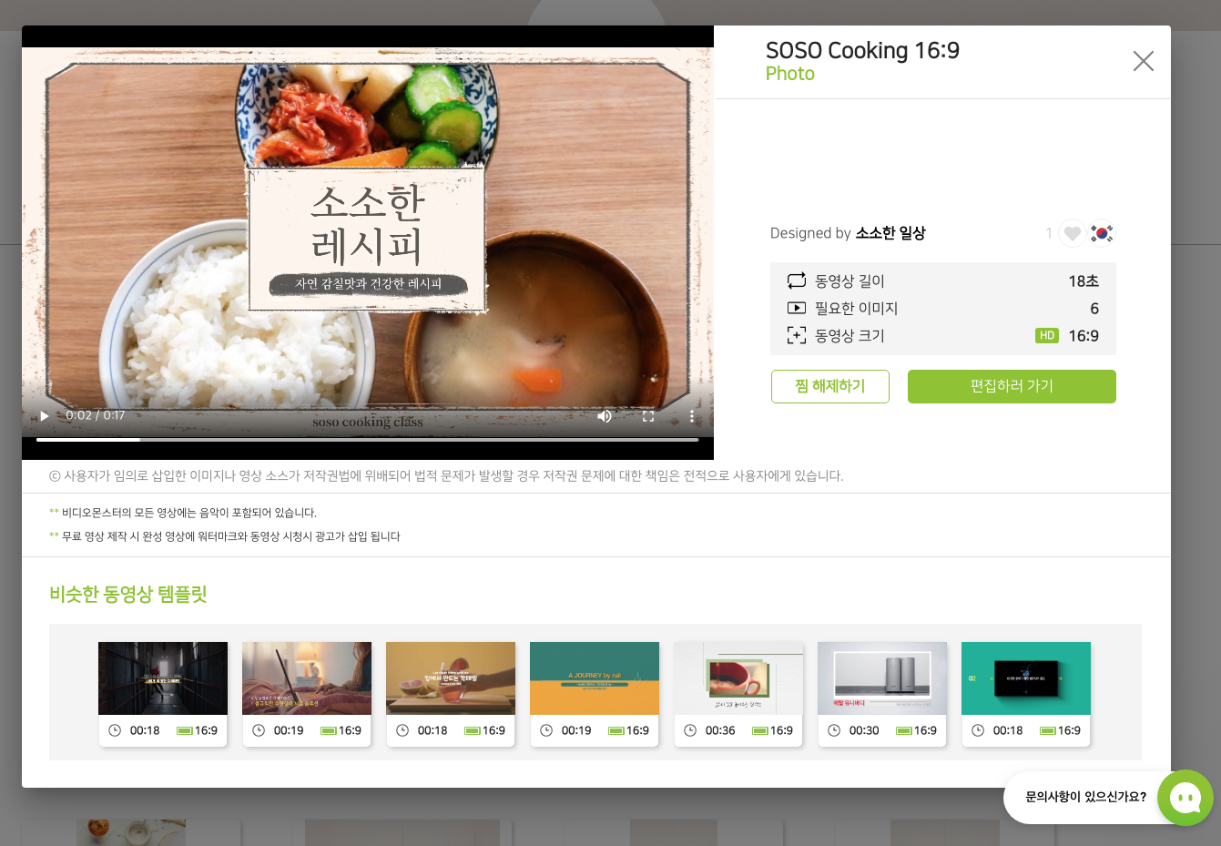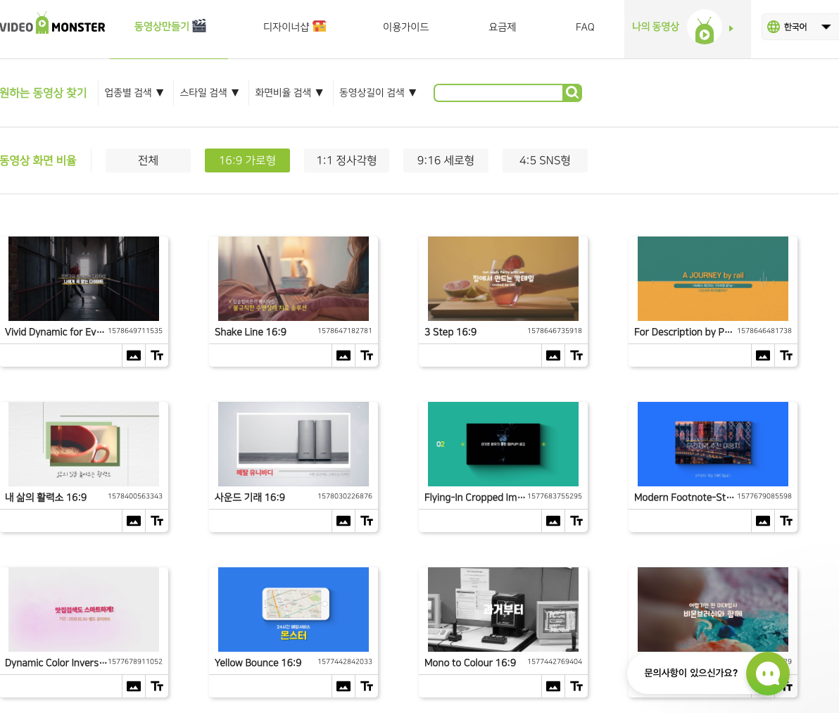 탬플릿을 선택하면 동영상 길이가 얼마나 되는지? 필요한 이미지는 몇장인지, 동영상 크기는 어떤지 정리해서 보여줍니다.