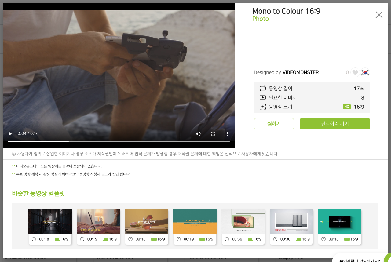 탬플릿을 선택하면 동영상 길이가 얼마나 되는지? 필요한 이미지는 몇장인지, 동영상 크기는 어떤지 정리해서 보여줍니다.