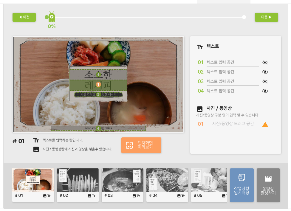 지정하는 곳에 텍스트를 적고 사진/동영상만 넣으면 끝입니다. 무료 동영상, 이미지 소스를 넣어서 완성해도 됩니다.