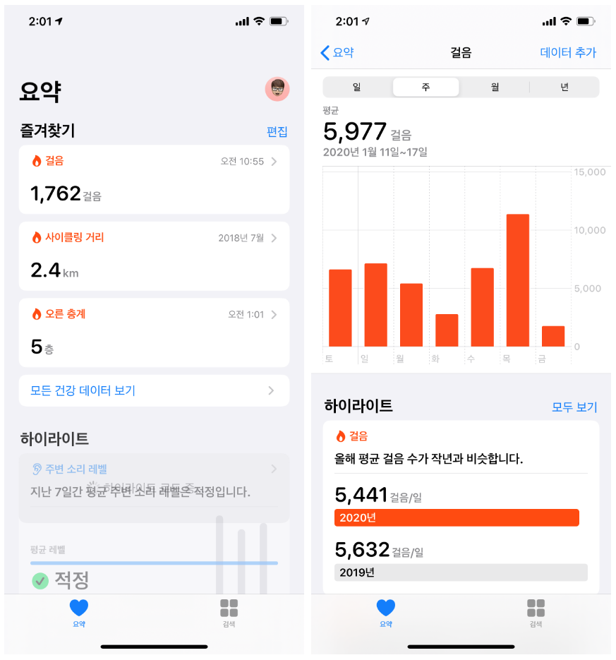 아이폰 건강 앱에서는 이런 일련의 활동들을 차트로 기록해서 보여줍니다. 아이폰만 들고 다녀도 체크가 되지만 스마트폰은 놓고 다닐때가 많고 심박동이라든지 운동 활동을 확인하기에는 한계가 있습니다. 그래서 아이폰의 건강앱을 제대로 활용하려면 애플워치는 필수 입니다.