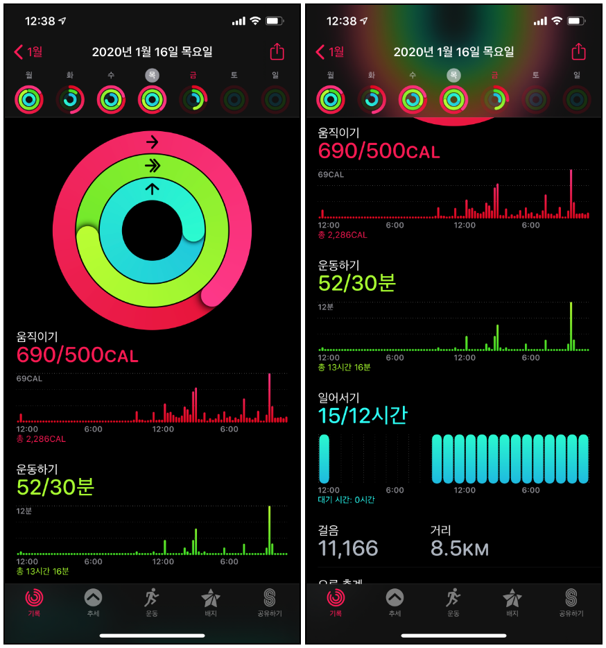 모든 기록은 아이폰의 활동앱에서 확인할 수 있습니다. 3개의 링을 다 채웠을때 왠지 뿌듯한 기분이 들게 되는데요. 이런 성취감을 통해 애플워치는 계속 움직이는 동기 부여가 됩니다.