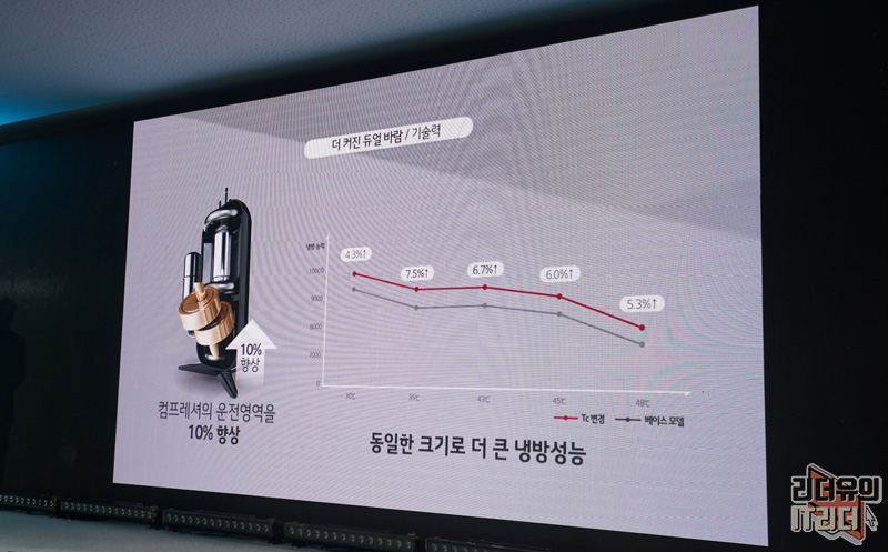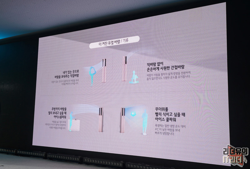 더 커진 듀얼바람으로 더 멀리에 있는 사람에게 직접 바람을 보낼수도 있고 직바람 없이도 은은하게 공간을 냉방시킬 수 있고 아이스롱파워를 통해 더 멀리있는 주방까지도 바람을 보낼 수 있고 빠른 냉방을 위한 아이스 쿨파워까지 더욱 강력한 냉방 성능을 기대해 볼 수 있습니다.