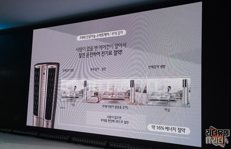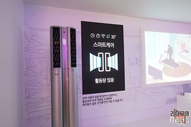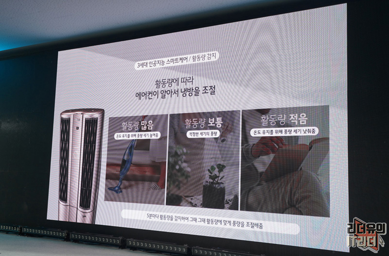 그리고 활동량에 따라 에어컨이 알아서 냉방을 조절하는 기술도 들어갔습니다. 활동량이 많으면 풍량을 더 세게 올려 온도 유지를 도와주고 활동량이 보통이면 적정 세기로 변경하고 활동량이 적으면 풍량 세기를 낮춰 효율적인 냉방을 하게 됩니다. 정말 똑똑해진 인공지능 에어컨입니다.