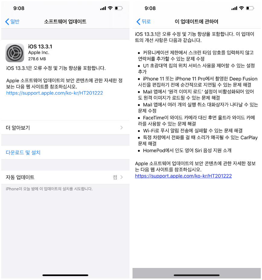 iOS13.3.1 용량은 278.6MB이고 위와 같은 오류 수정 및 기능 향상이 진행되었습니다.