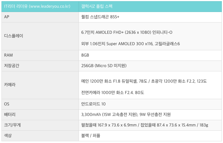 자세한 갤럭시Z 플립 스펙은 아래 표를 참고해 보시기 바랍니다.