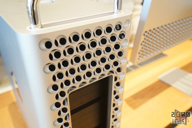 2019 맥 프로 디자인은 그 어떤 맥보다 강력한 맥을 강조하는 디자인을 볼 수 있습니다. 알루미늄 하우징과 스테인리스 스틸 공간 프레임을 사용해 단단하면서도 고급스러운 매력을 보여주고 있습니다. 그리고 맥 프로의 디자인 포인트라 할 수 있는 전면 홀은 디자인 매력도 있지만 기능성으로 효과적인 열 배출을 하게 됩니다. 구멍 하나에 3개의 구멍이 뚫려 잇는 격자 패턴으로 공기의 흐름을 더욱 효과적으로 만들어 주고 있습니다. 케이스 하나에도 이런 섬세함을 담았다는데 놀라운 매력을 느낄 수 있습니다.
