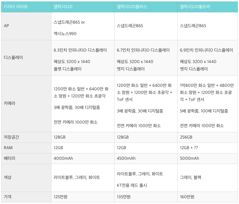 삼성 갤럭시S20은 이미 알려졌다시피 3종의 모델로 출시가 되고 스펙 차이를 통해 가격 전략을 달리 하고 있습니다. 스펙은 다음과 같습니다.