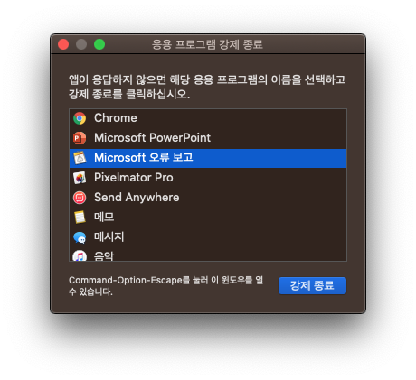 이렇게 응용 프로그램 강제 종료 모드가 나옵니다. 여기서 종료할 프로그램을 선택해서 강제 종료하면 됩니다.