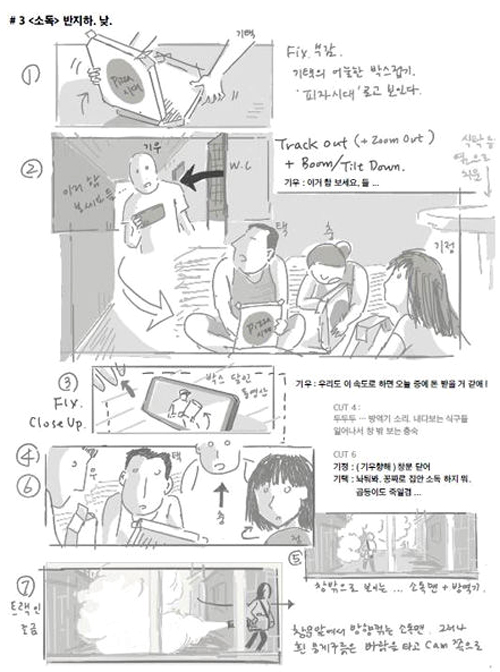 봉준호 감독은 인터뷰를 통해 아이패드와 애플펜슬로 직접 스토리보드를 그린다고 이야기 했습니다. 기생충 뿐만 아니라 이전 작품들도 아이패드로 직접 스토리보드를 그리는 것으로 알려져 있는데요. 기생충의 장면 장면들을 만화처럼 콘티를 그려 넣어 영화 속 장면을 그대로 만들어 냈습니다.