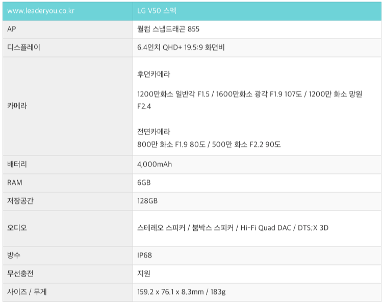 참고로 LG V50 ThinQ 스펙은 다음과 같습니다.