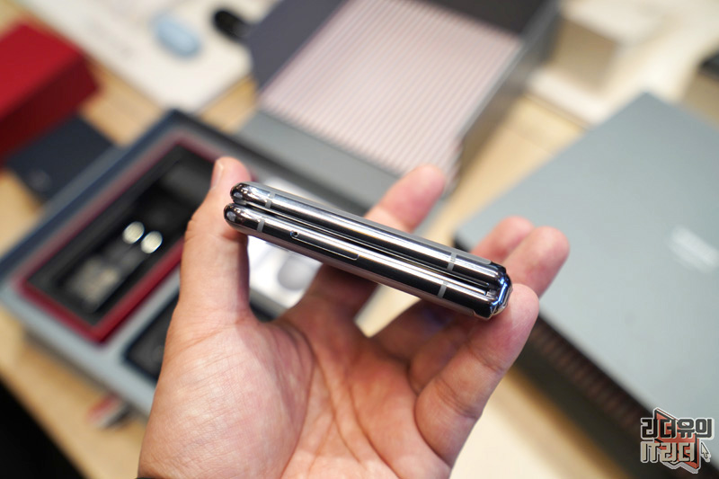갤럭시Z 플립 톰브라운 에디션 옆면 모습입니다. 메탈의 반짝이는 느낌이 고급스러운 매력을 한층 올려주고 있습니다.