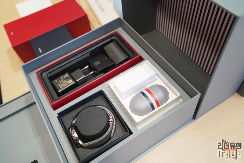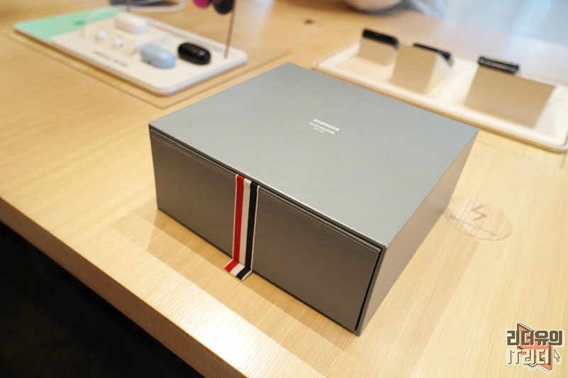 겉에 상자를 빼면 안쪽에 톰브라운 패키지를 느낄 수 있는 상자가 들어 있습니다. 톰브라운을 상징하는 3색의 라인과 삼성 톰브라운 표시가 되어 있습니다.