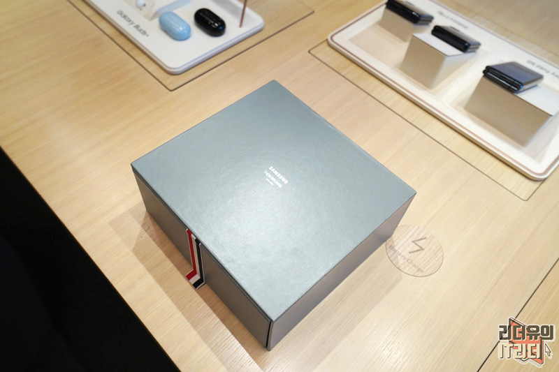 아래쪽에는 서랍 형태로 갤럭시Z 플립 톰브라운 에디션 가죽케이스와 갤럭시 워치 액티브2 스포츠 밴드가 들어 있습니다.