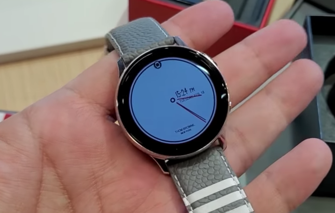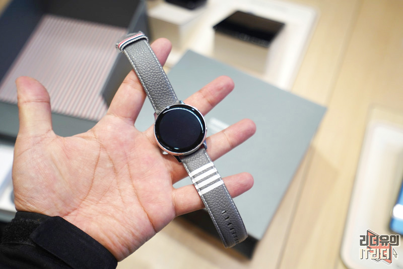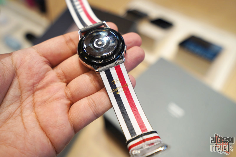 갤럭시 워치 액티브2 톰브라운 에디션은 밴드의 가죽으로 차별화를 주고 있습니다. 회색 밴드에 4선 화이트를 적용해 톰브라운 제품임을 느낄 수 있게 했습니다.