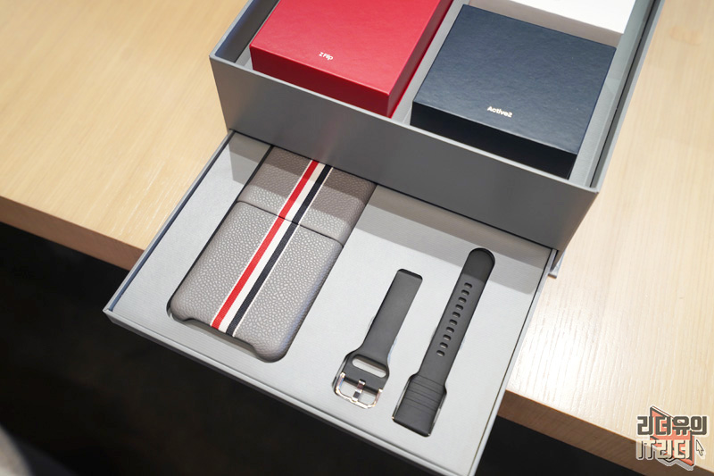 아래쪽에는 서랍 형태로 갤럭시Z 플립 톰브라운 에디션 가죽케이스와 갤럭시 워치 액티브2 스포츠 밴드가 들어 있습니다.